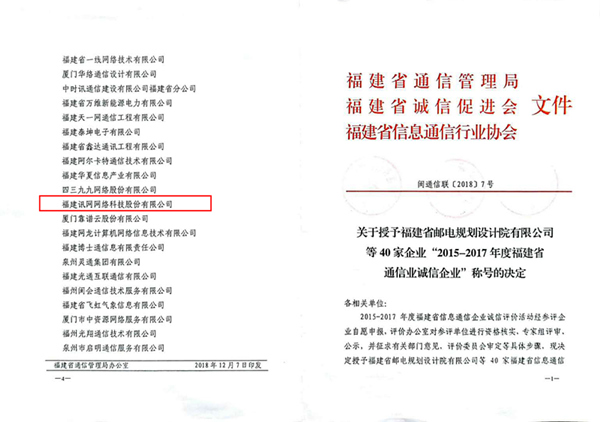 12月11日,福建省信息通信行業協會第四屆理事會第三次會議暨2015-2017年度福建省信息通信業誠信企業”表彰儀式在福州召開,福建訊網網絡科技股份有限公司(簡稱“訊網網絡”)繼榮獲“2012-2014年度福建省通信業誠信企業”后,再次榮獲此殊榮。